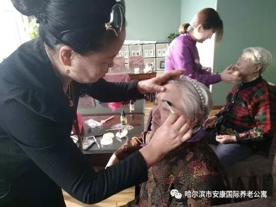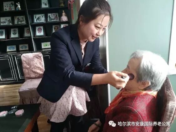 “化妆师”为每位老人化妆,新的一年新的面貌,就算是老了,我们也要做最漂亮的“老太太”